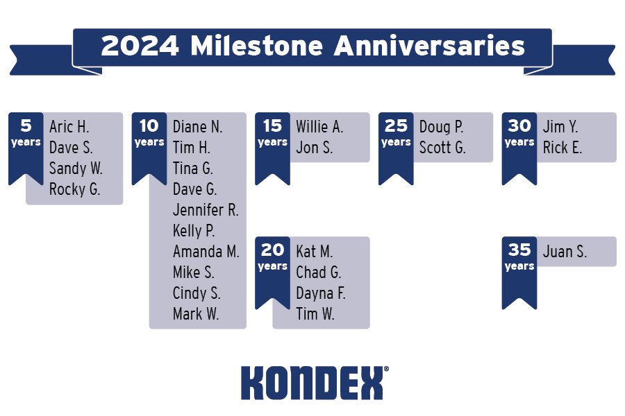 Kondex recently recognized its associates who celebrated milestone anniversaries in 2024. This year, there were 25 team members with anniversaries ranging from 5 to 35 years of service. Their combined tenure totals an impressive 375 years! Please join us in celebrating the dedication of our team:
